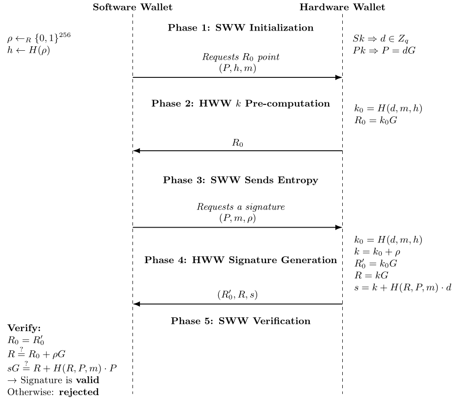 Ara bé, no tot és desastrós. Andrew Poelstra i Jonas Nick van fer una proposta per prevenir que la generació del nonce únicament depengués del hardware wallet. La seva proposta es basa a prevenir aquests tipus d’atacs mitjançant la compartició de secrets entre la hot wallet i cold wallet. Principalment, el seu funcionament obliga als dos participants a comprometre’s a secrets compartits i que el valor aleatori de la signatura sigui generat en part per aquests secrets, d’aquesta manera quan se signi la transacció, el hot wallet pugui validar que s’ha generat de forma correcta i l’usuari pot assegurar-se que el hardware wallet genera el valor de manera aleatòria.